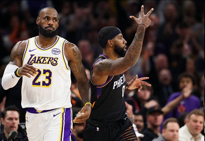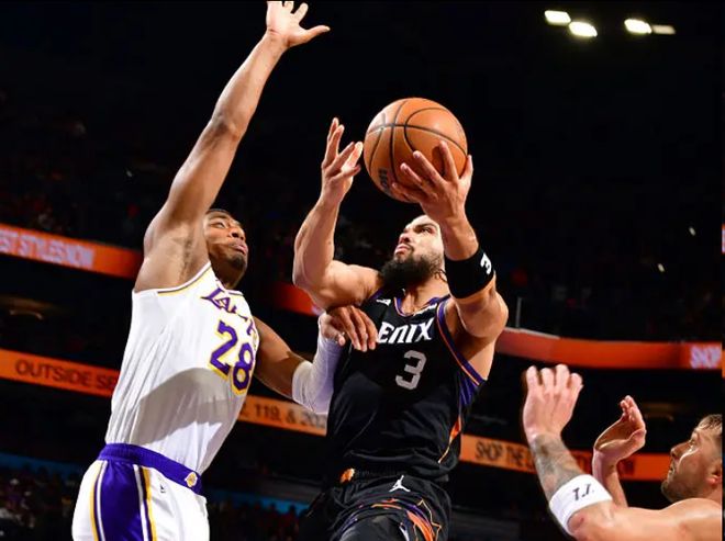关键时刻,詹姆斯两分命中,太阳两罚都有,球队落后湖人两分。随后,湖人进攻,斯马特的突破上篮被邓恩封盖不中之后,太阳打出快攻反击,尽管布克三分不中,但是随后太阳抢到前场篮板,布克助攻狄龙,后者三分命中,太阳114-113反超比分。