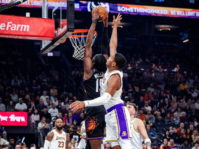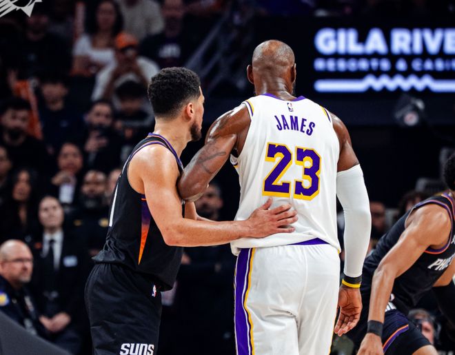 节末布鲁克斯再度抢断老詹,八村塁轰三分,老詹连续罚球追成62平!下半场布鲁克斯早早5犯,布克和马威发力上分,湖人进攻只剩东契奇单打,老詹接球又失误出界。艾顿弹无虚发,太阳进攻也哑火,节末海斯暴扣+詹姆斯上篮+文森特三分,湖人三节打完时,86-77领先太阳9分,前后打出一波15-0!决战第四节,詹姆斯转换上篮+拉拉维亚造犯规,海斯继续强攻造杀伤,詹姆斯借掩护轰进三分球,湖人前后打出24-0,太阳已经8分钟没有任何得分!阿伦罚球终于打破得分荒,不过海斯和拉拉威亚继续暴扣,湖人最多拉开20分分差。