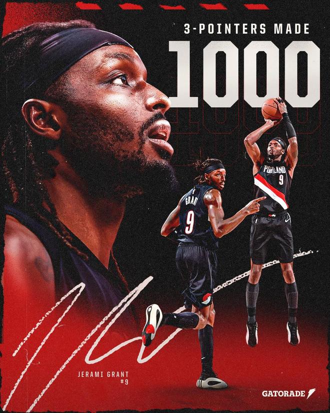 值得一提的是,在本场比赛中格兰特达成了自己职业生涯1000记三分球的里程碑。开拓者队官方也晒出海报为其庆祝。